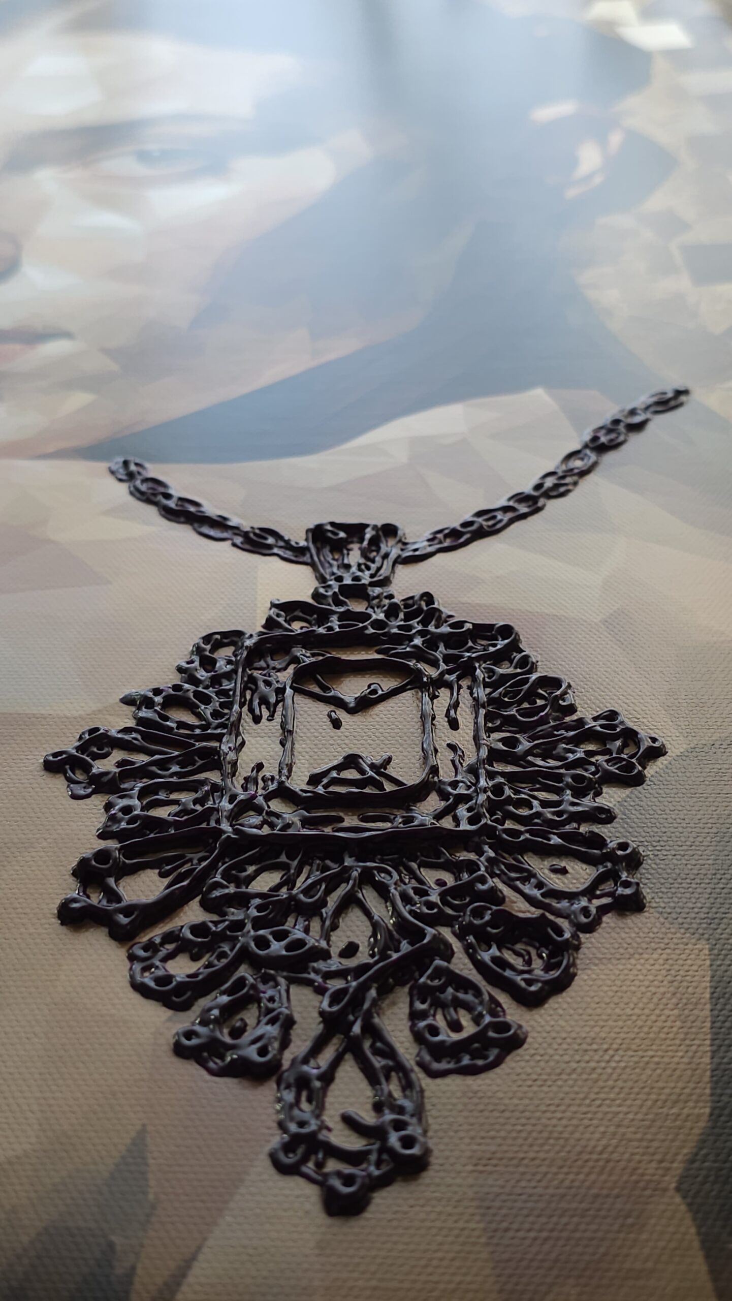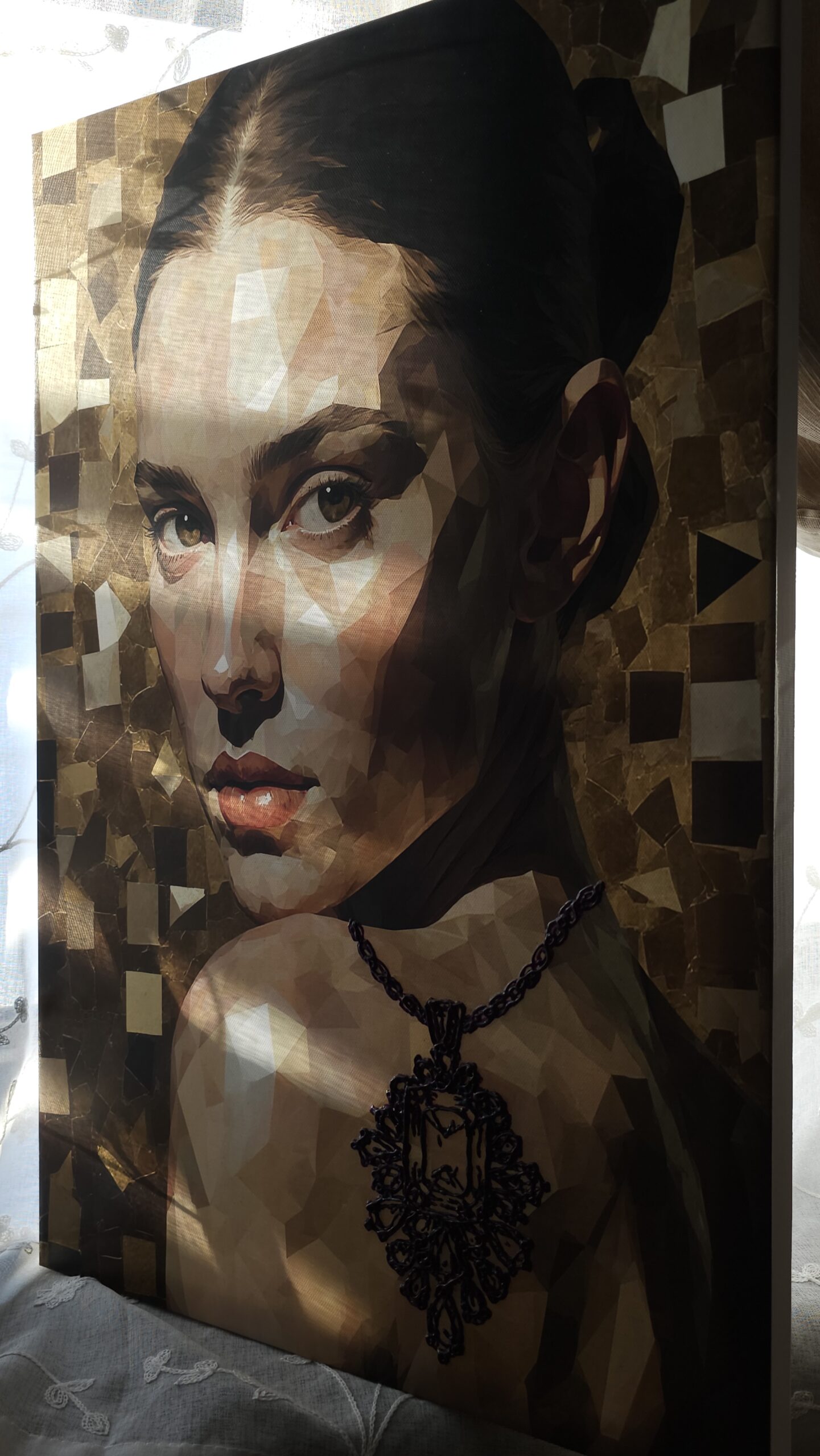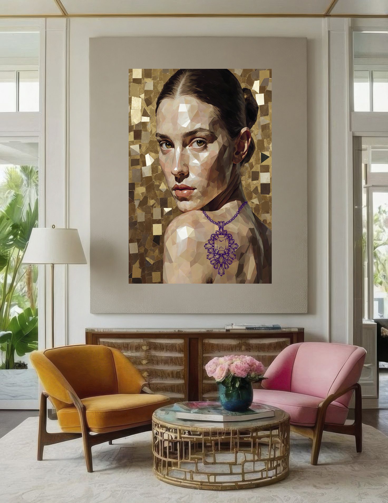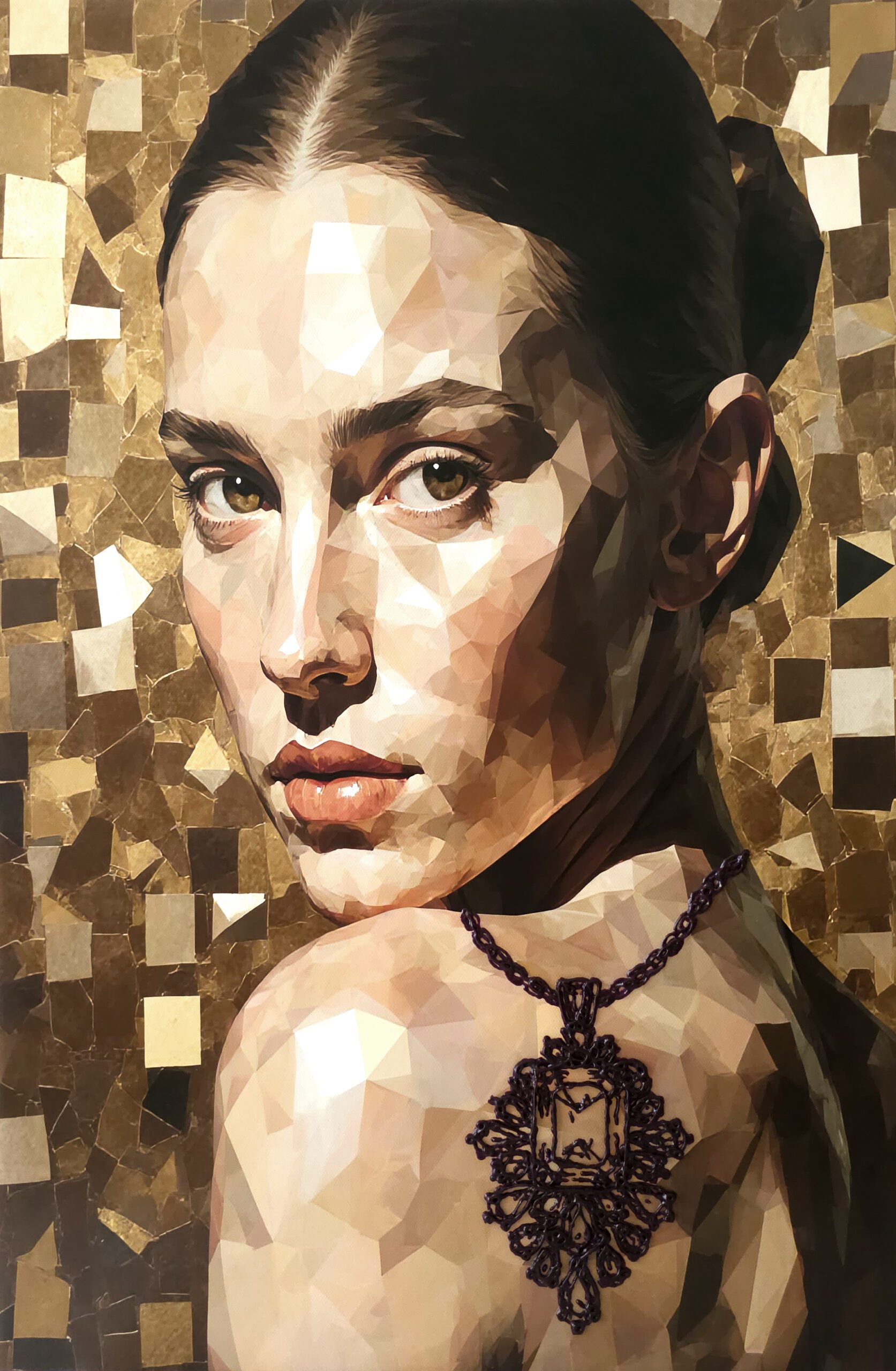 The figure and background are created through an AI-based process, representing the increasing dilution of individual identity in modern society, where human presence is often treated as interchangeable within larger systems. In contrast, the jewelry elements are hand-painted to emphasize the irreplaceable and deeply personal aspects of selfhood—our core identity that cannot be replicated or automated.