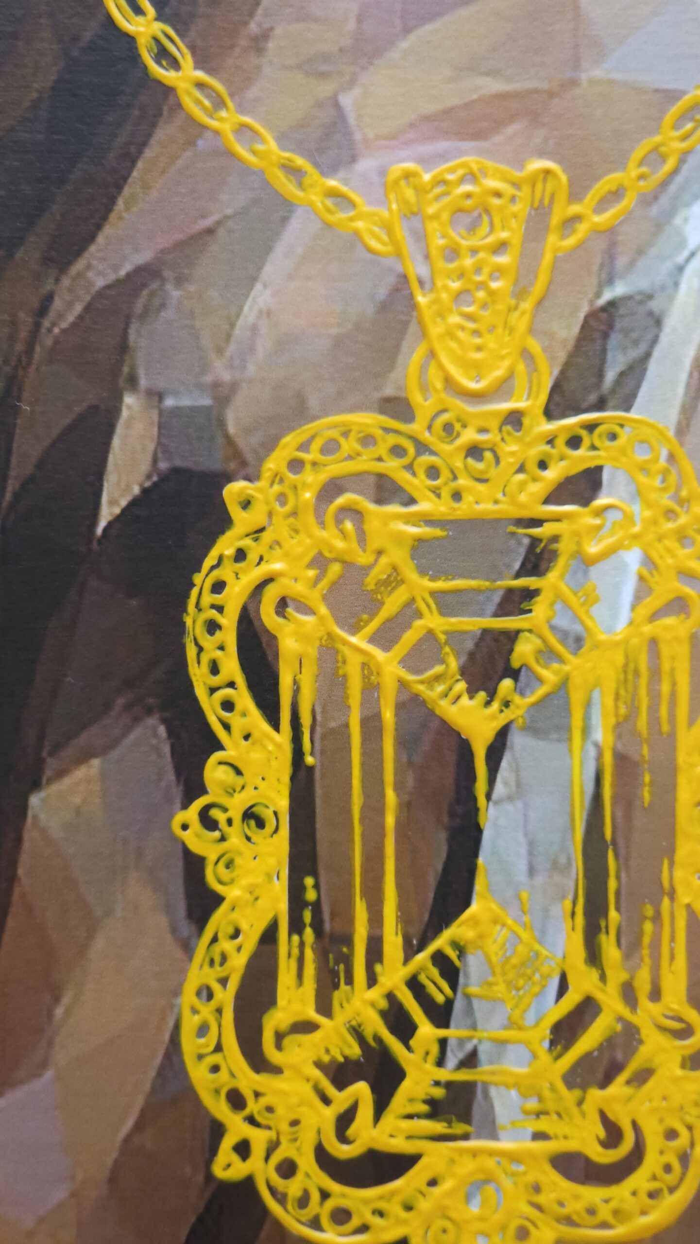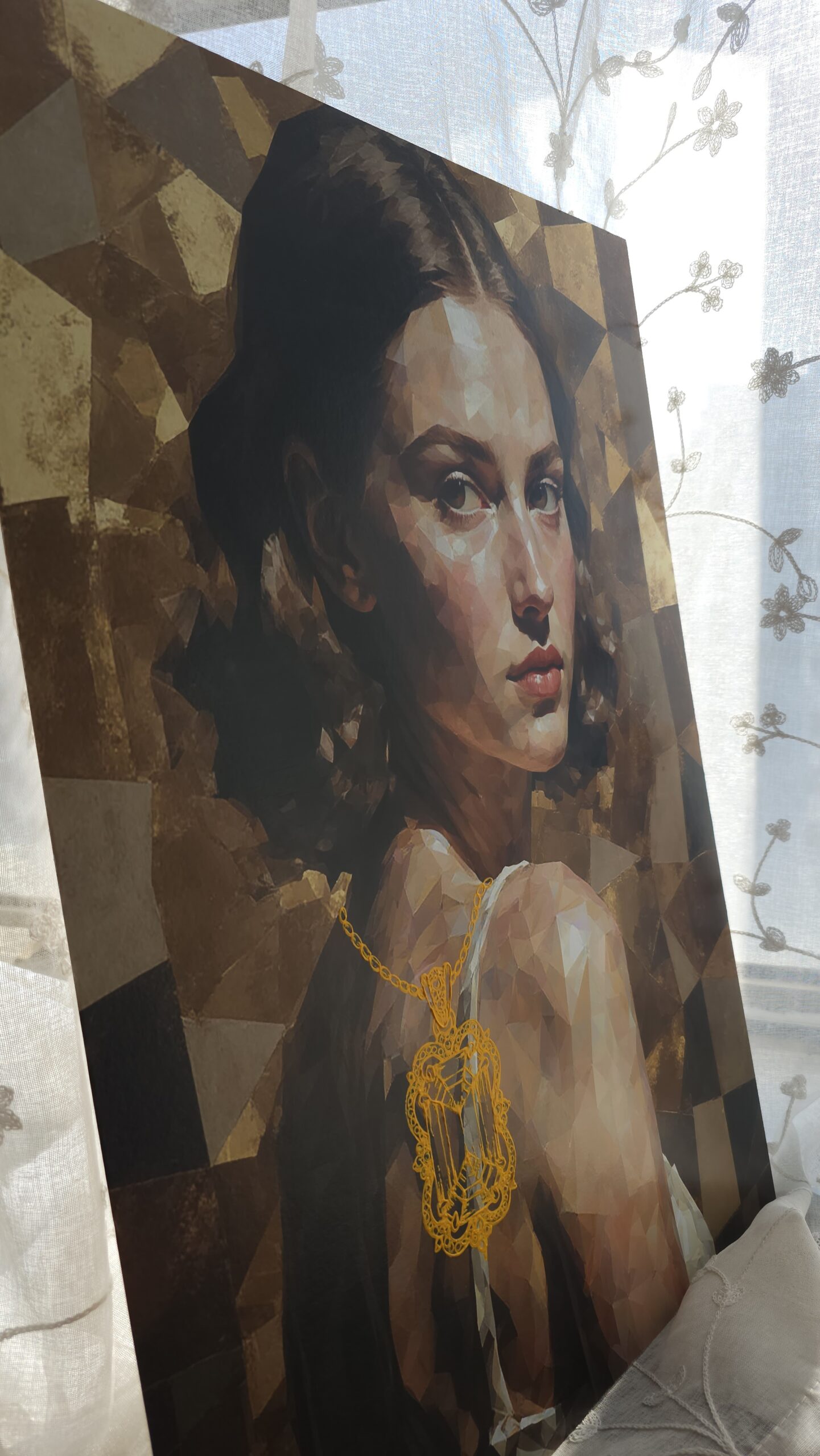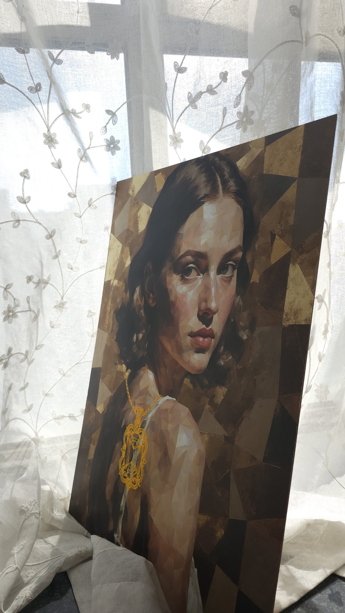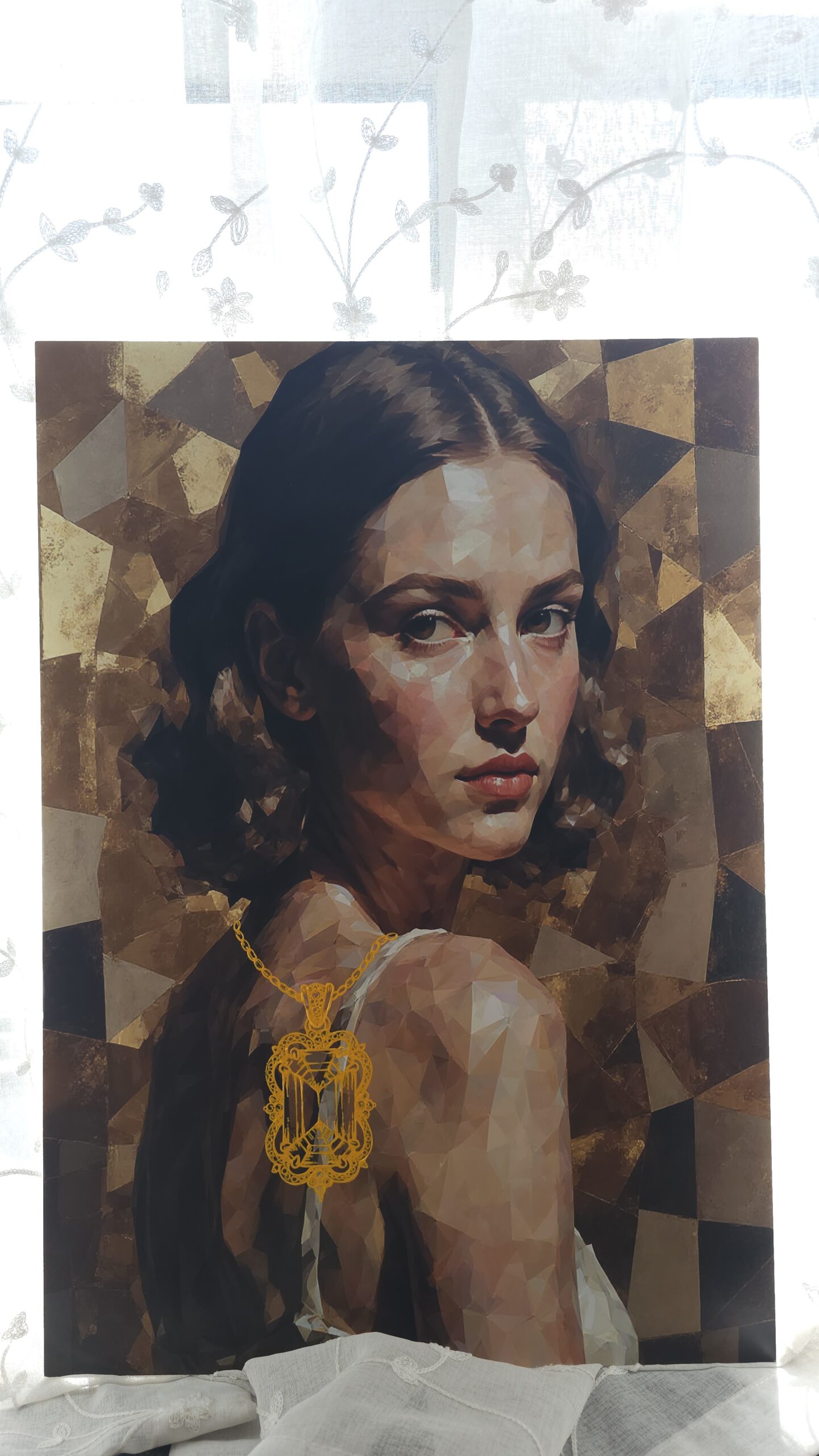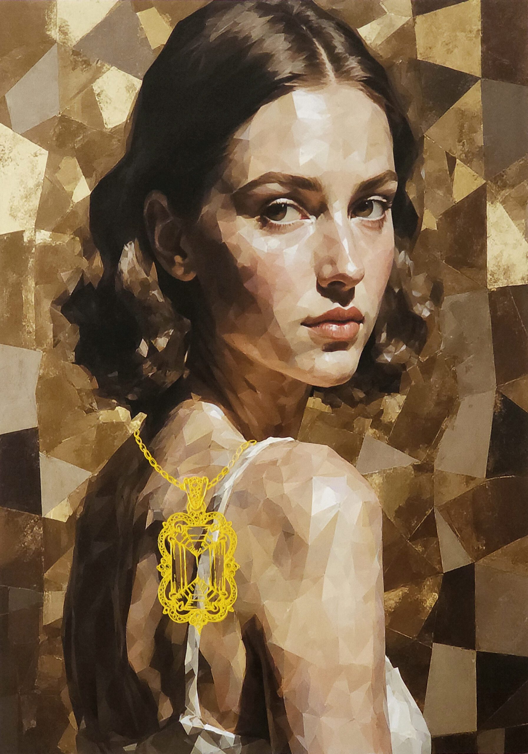 The figure and background are created through an AI-based process, representing the increasing dilution of individual identity in modern society, where human presence is often treated as interchangeable within larger systems. In contrast, the jewelry elements are hand-painted to emphasize the irreplaceable and deeply personal aspects of selfhood—our core identity that cannot be replicated or automated.